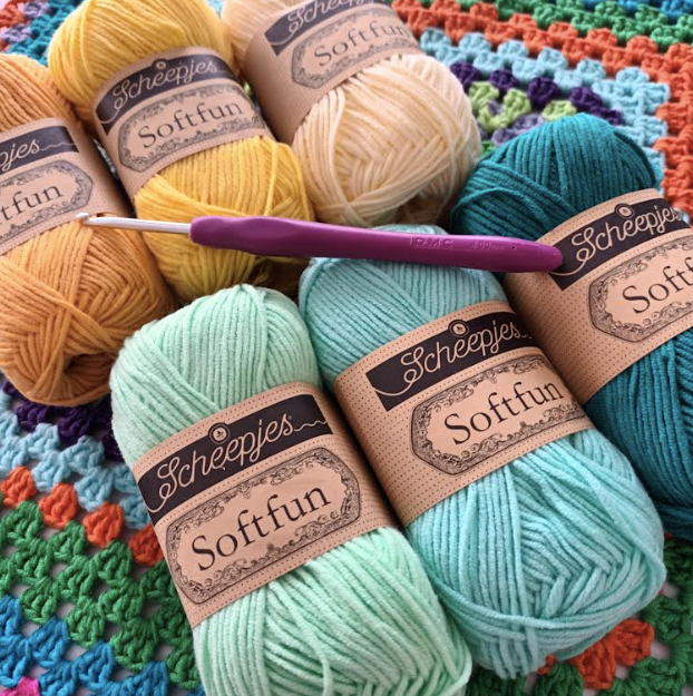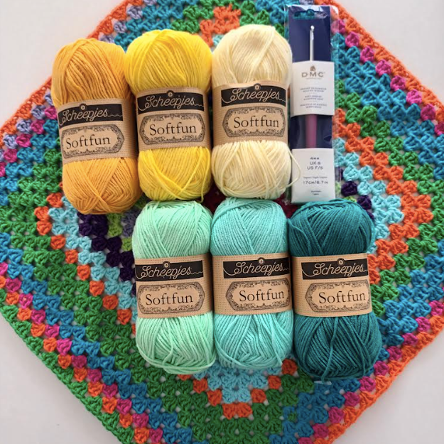 - Benodigde garen om granny squares te maken (Scheepjes Softfun)